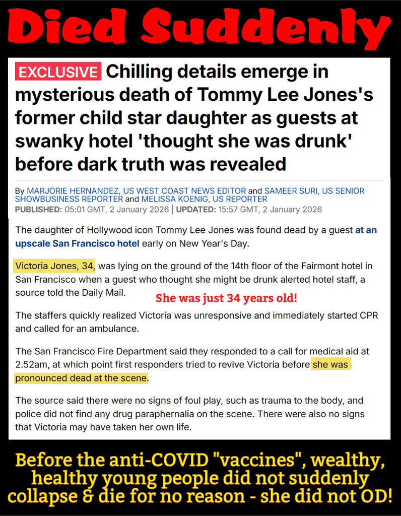 Another celebrity who was just 34 years old, right after the 27 year old Swedish athlete found dead in his hotel room. Remember: for each celebrity who suddenly dies, there are HUNDREDS of normal people who suffer the same fate, but we never hear about them! https://www.dailymail.co.uk/tvshowbiz/article-15428093/Death-Tommy-Lee-Jones-daughter-Victoria-Fairmont.html