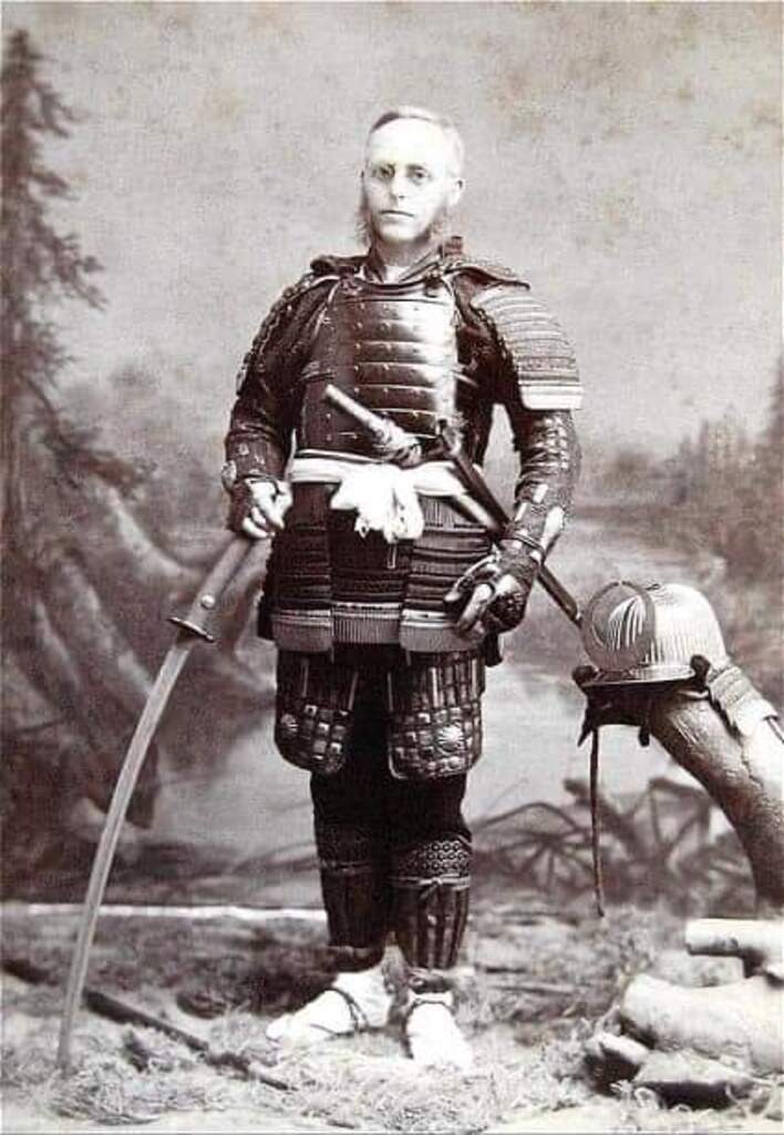 A western tourist in Japan who paid to take a photo with Samurai armour on, 1890