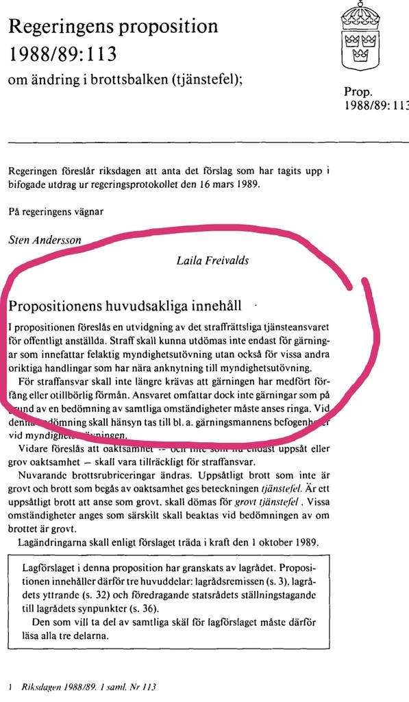 Propositionens huvudsakliga innehåll. ""I propositionen föreslås en utvidgning av det straffrättsliga TJÄNSTEANSVARET för offentligt anställda. Straff skall kunna utdömas inte endast för gärningar som innefattar felaktig myndighetsutövning utan också för vissa andra oriktiga handlingar som har nära anknytning till myndighetsutövning."" Länk till källa : https://www.riksdagen.se/sv/dokument-lagar/dokument/proposition/om-andring-i-brottsbalken-tjanstefel_GC03113