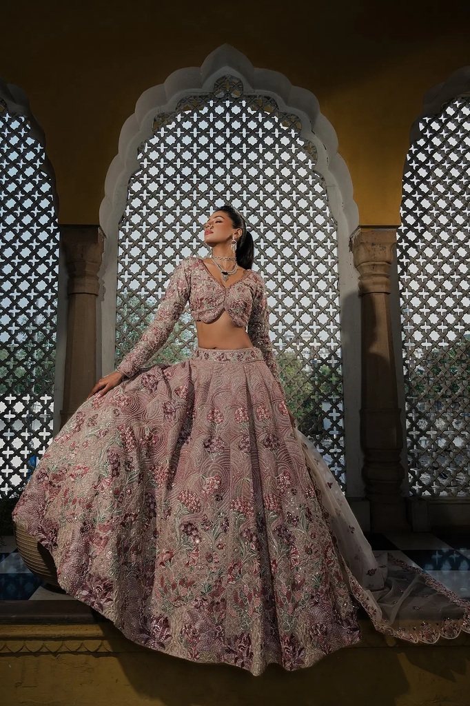 Pale Pink Organza Designer Lehenga with Pentagon Neck Blouse