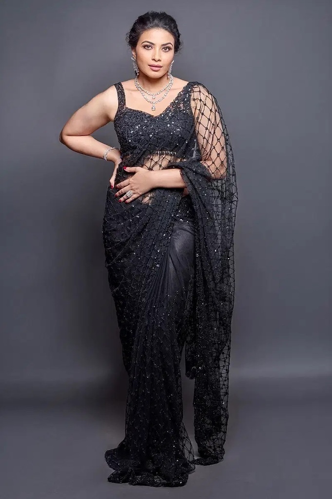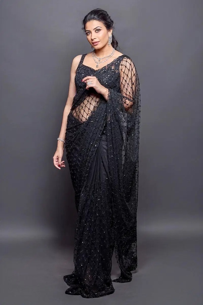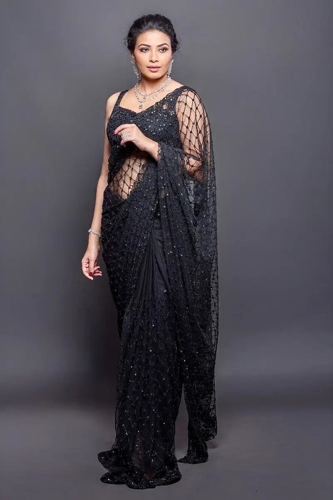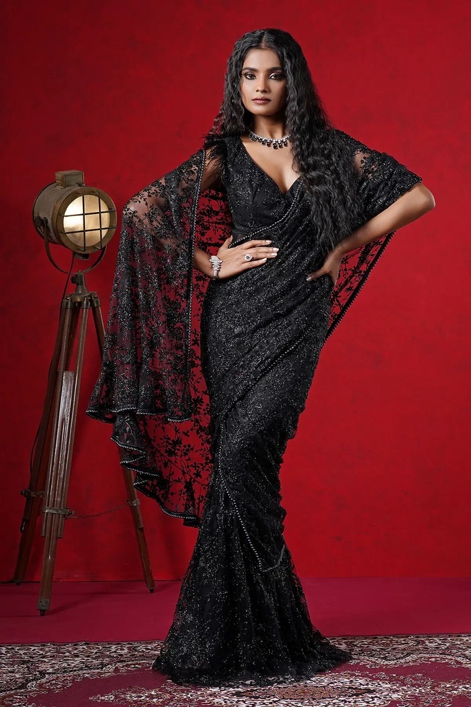 Pink and Lavender Shaded Net Designer Saree with Embroidered Sleeveless Blouse