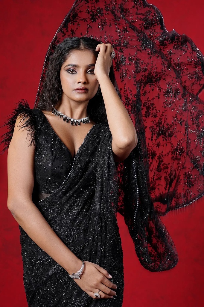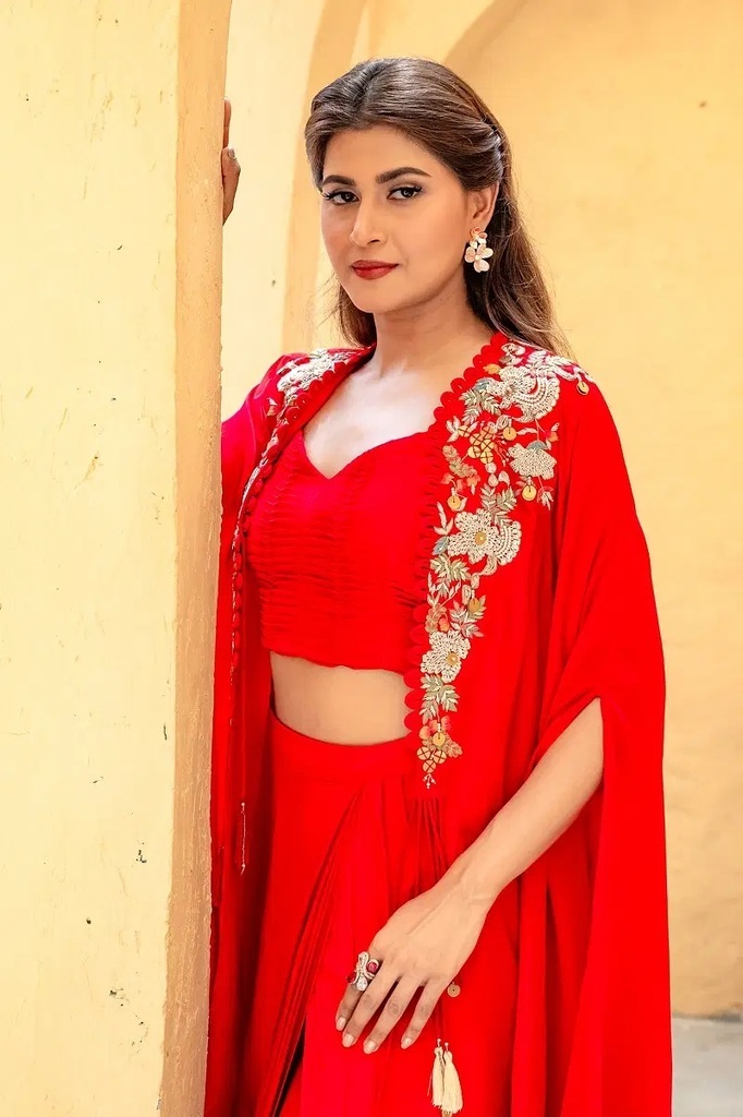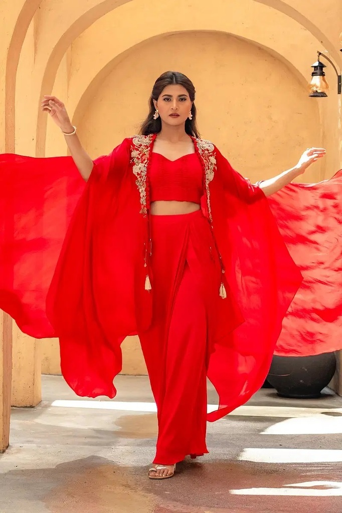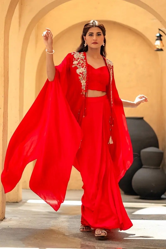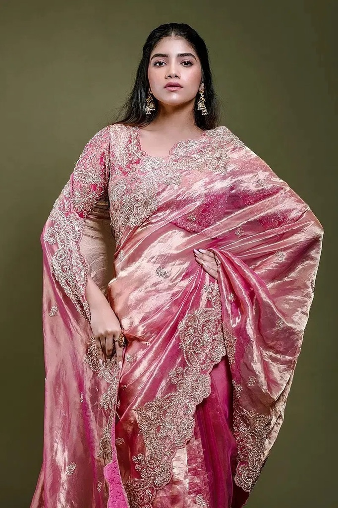 Cream Pink Tissue Crop Top Suit with Stone Work and Draped Bottom