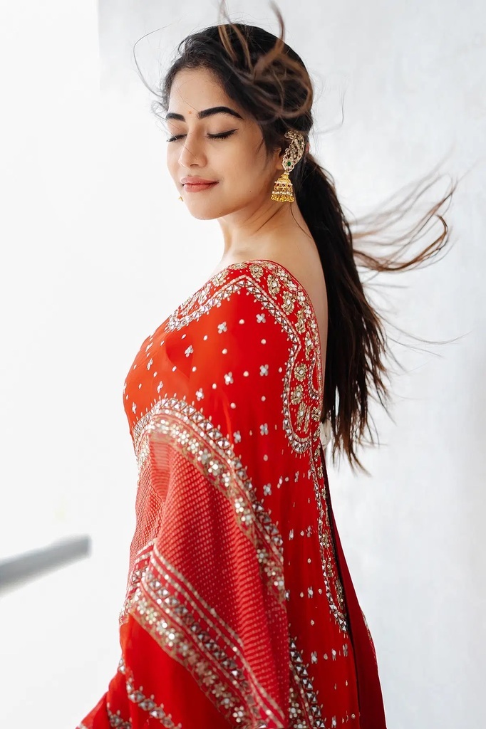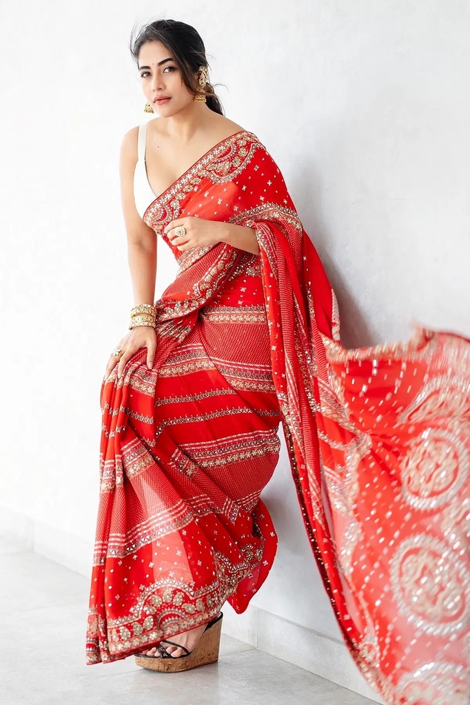 Rust Orange Printed Crepe Designer Saree with Embroidered Readymade Blouse