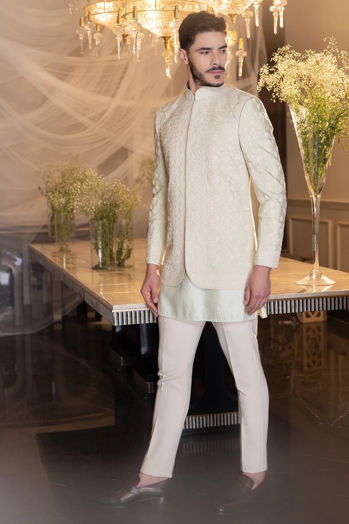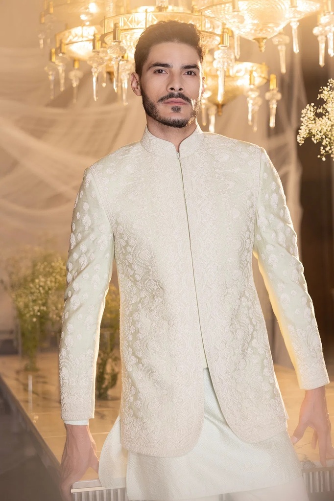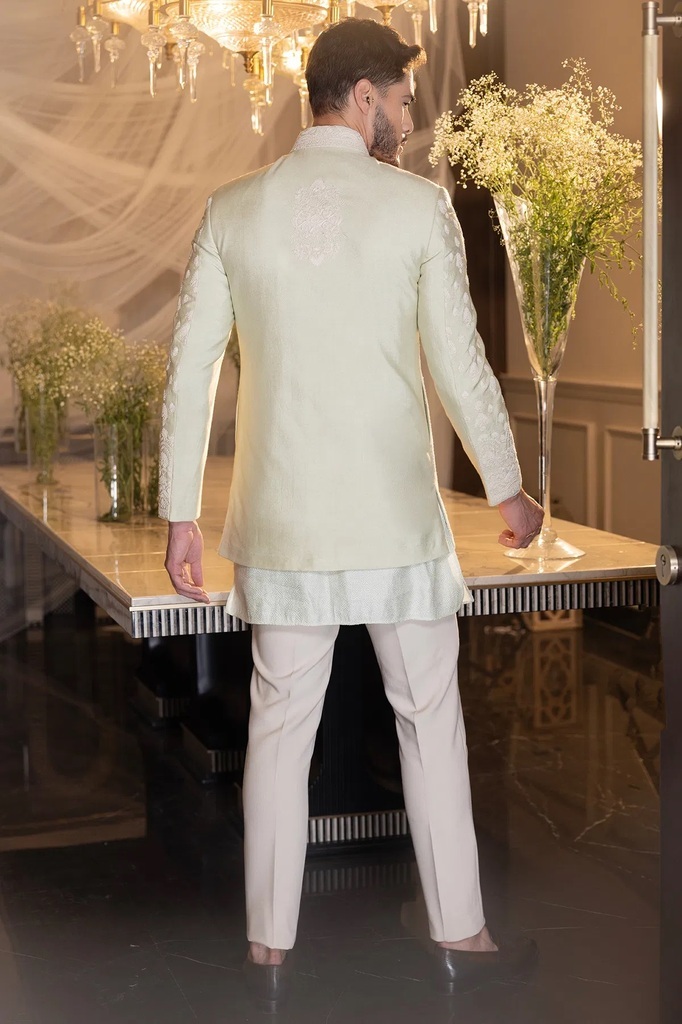Pale Green Resham Embroidered Silk Indowestern Sherwani