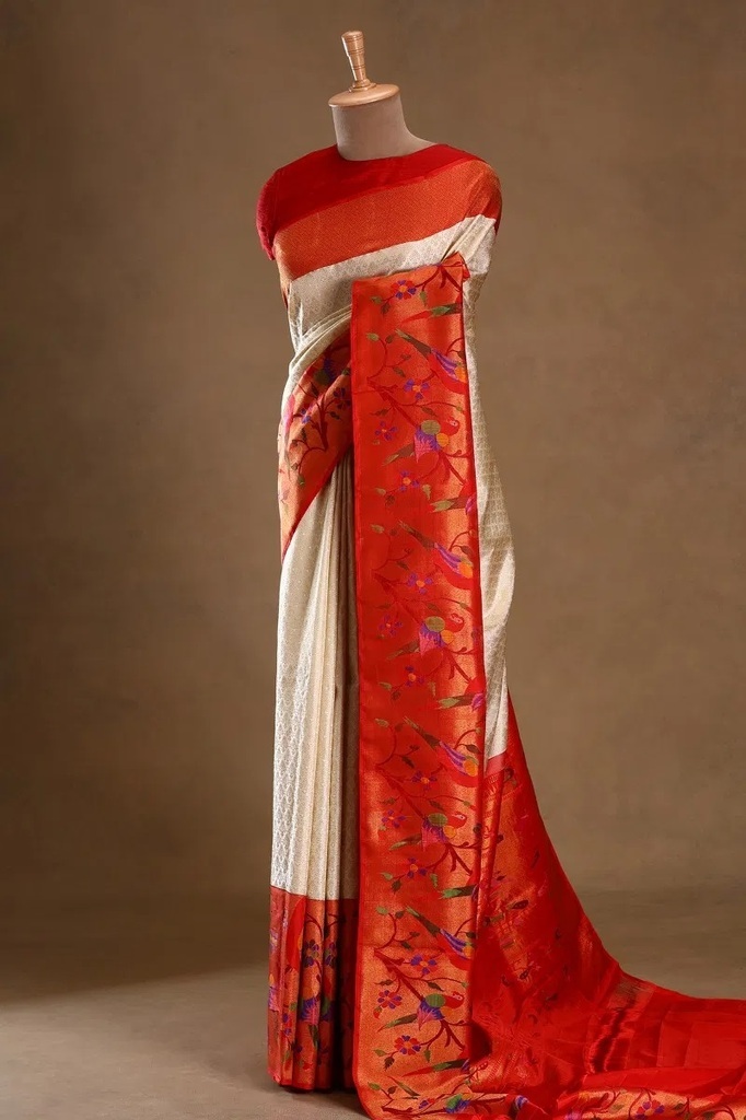 White Kanchipuram Silk Saree with Parrot Motif Border and Unstitched Blouse