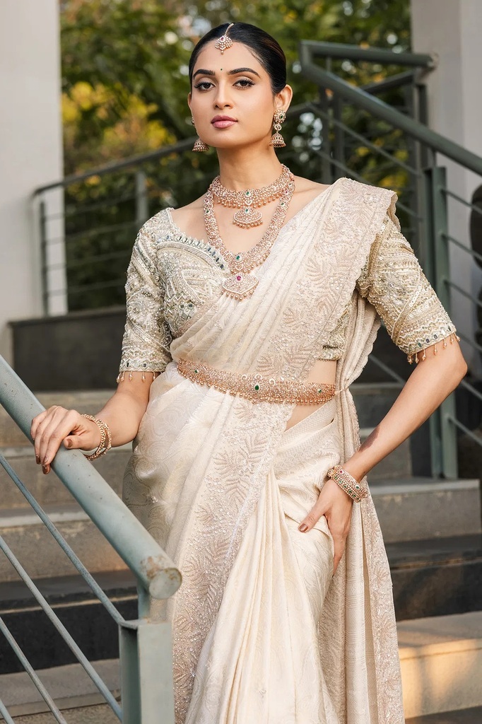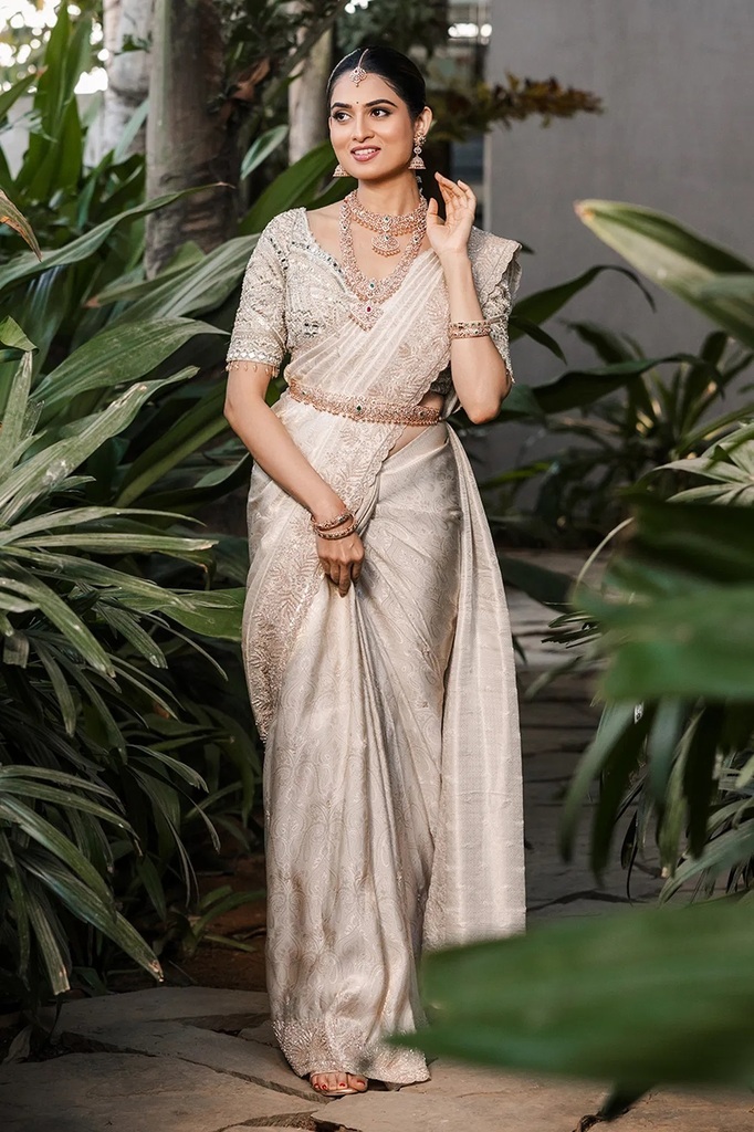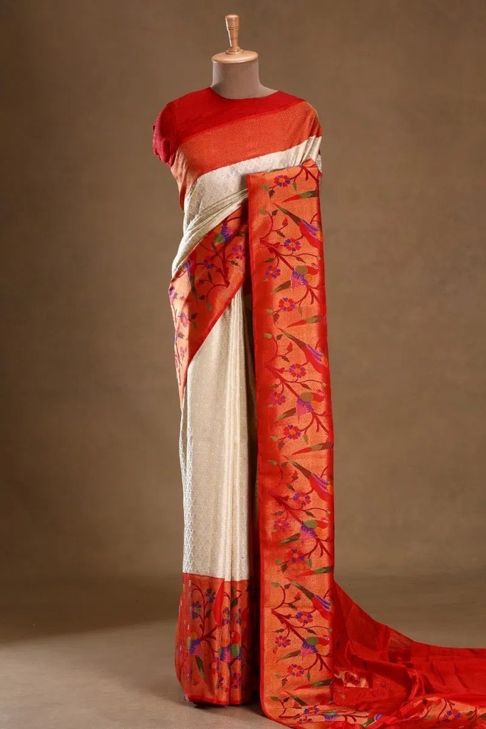 Cream Zari Woven Brocade Designer Saree with Unstitched Blouse