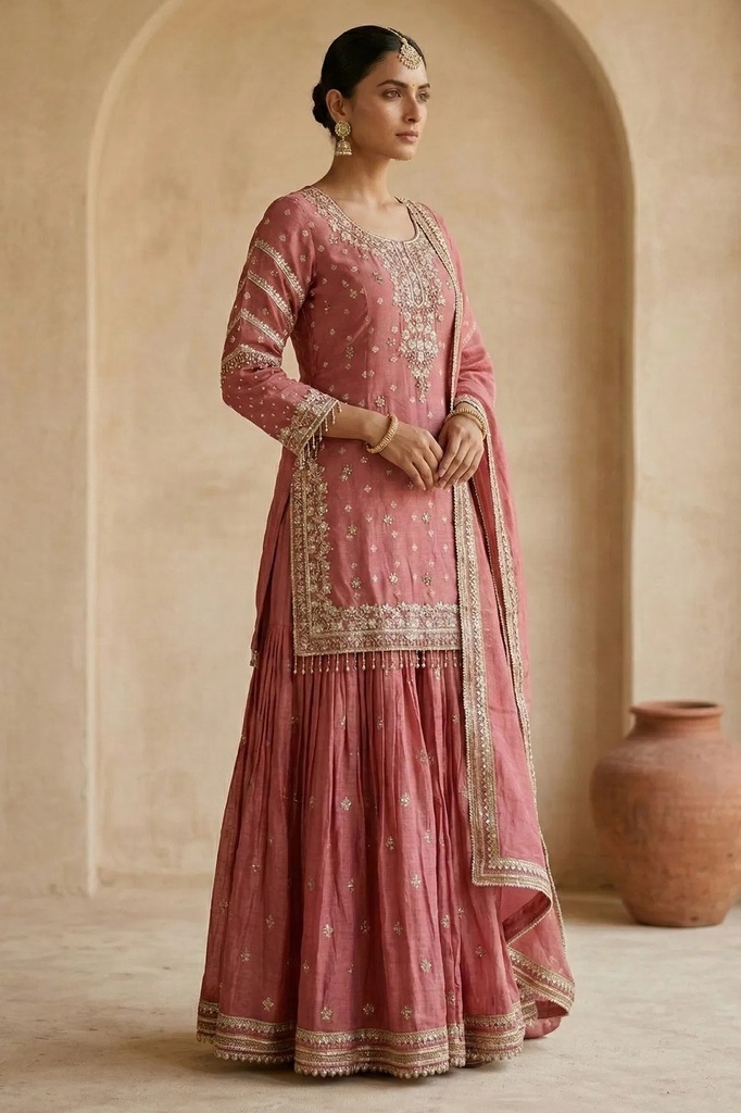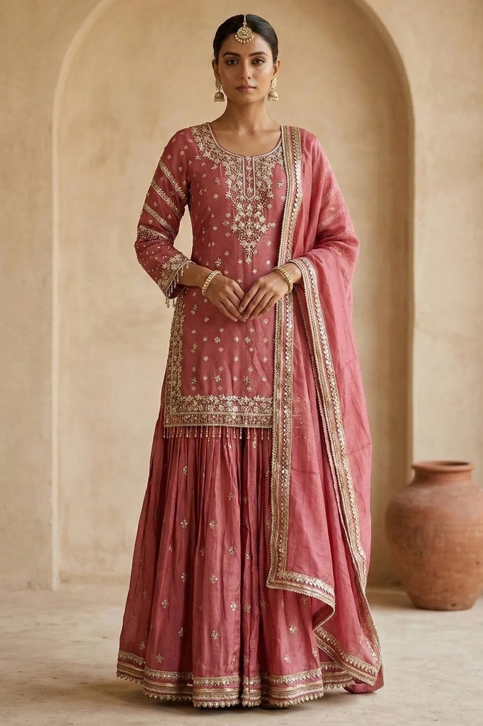 Candy Pink Sequins Embroidered Tissue Sharara Suit