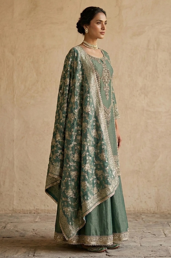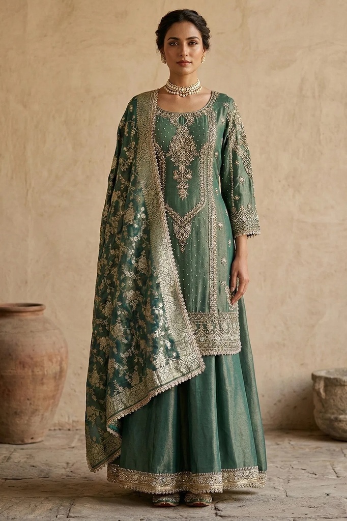 Dark Green Zardosi Embroidered Tissue Sharara Suit