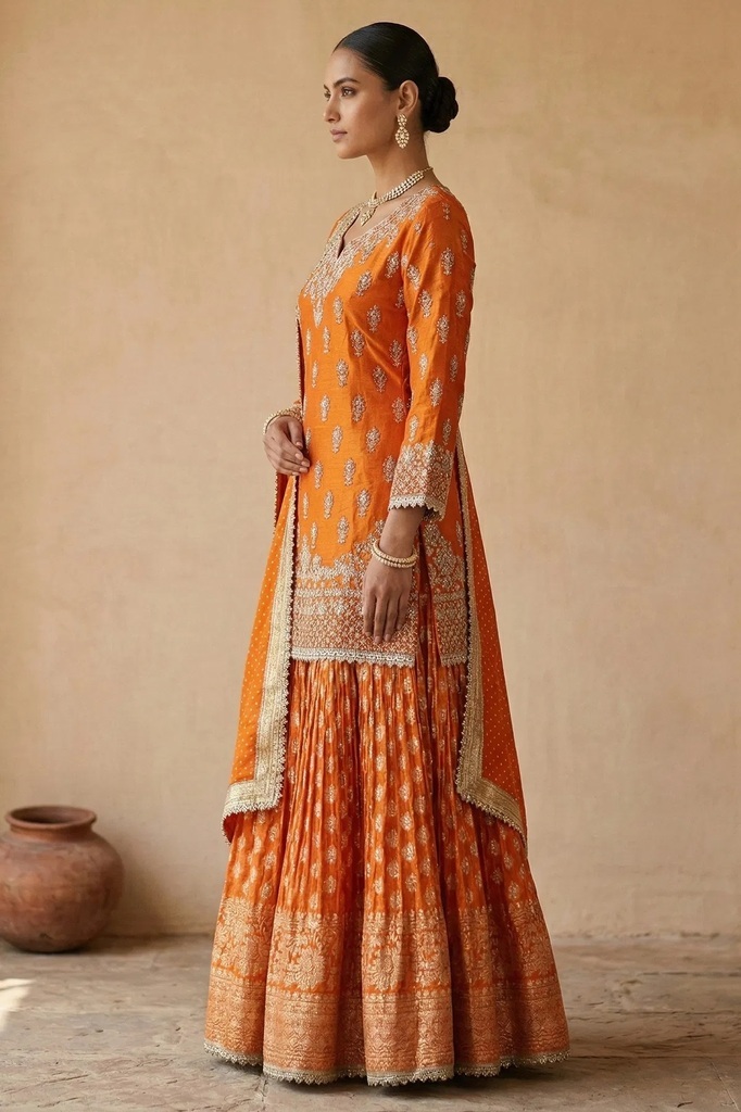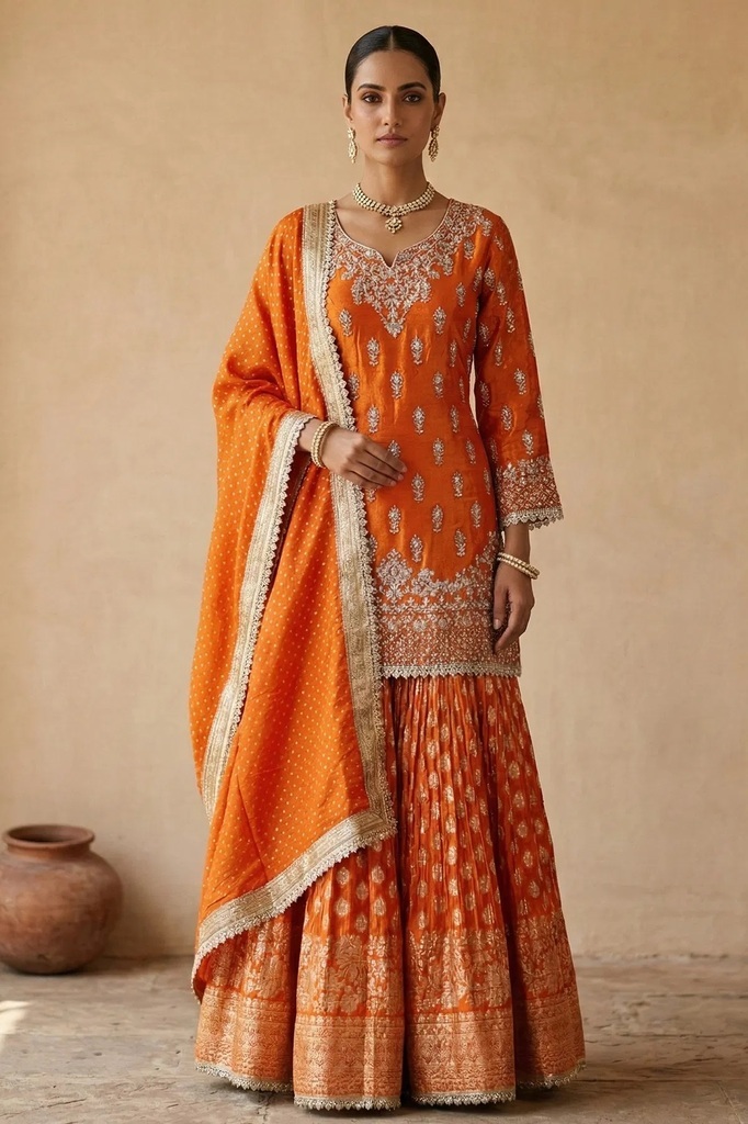 Bright Orange Sequins Embroidered Tissue Sharara Suit