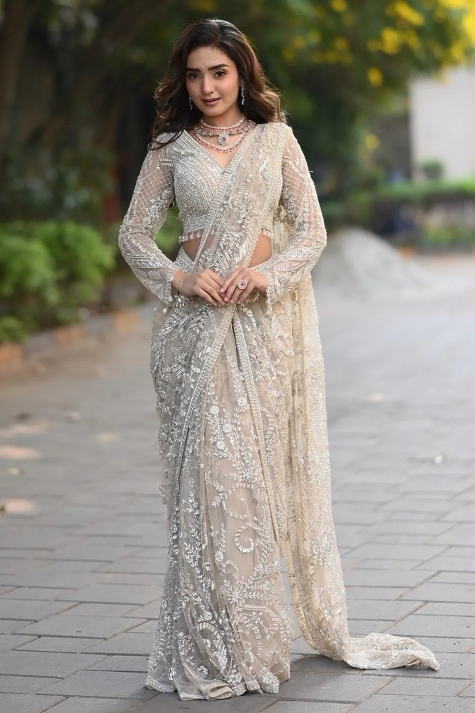 Beige Net Ready To Wear Saree with Embroidered Full Sleeve Blouse