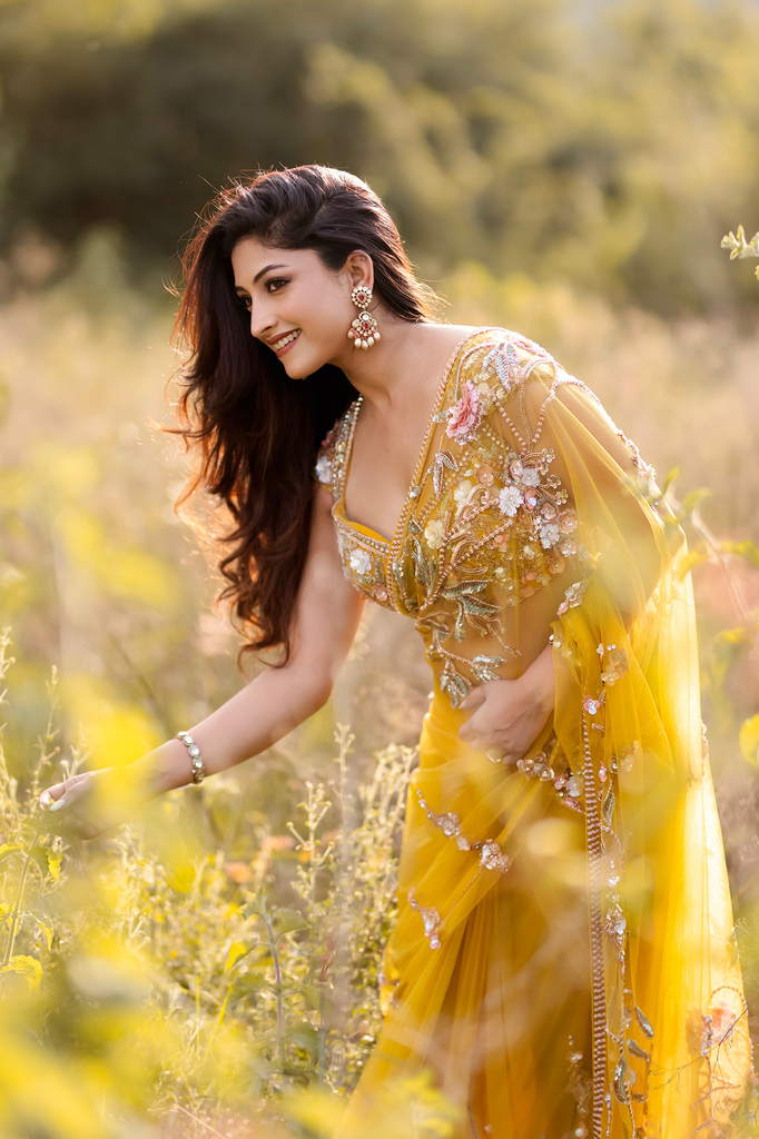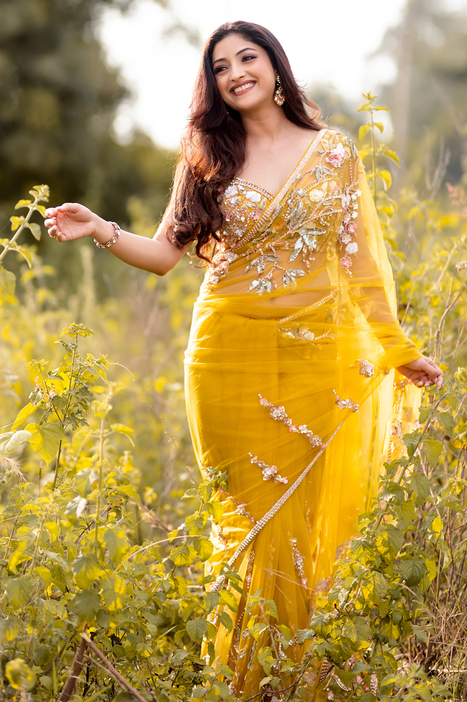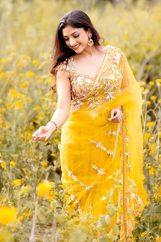 Yellow Net Designer Saree with Embroidered Sleeveless Blouse
