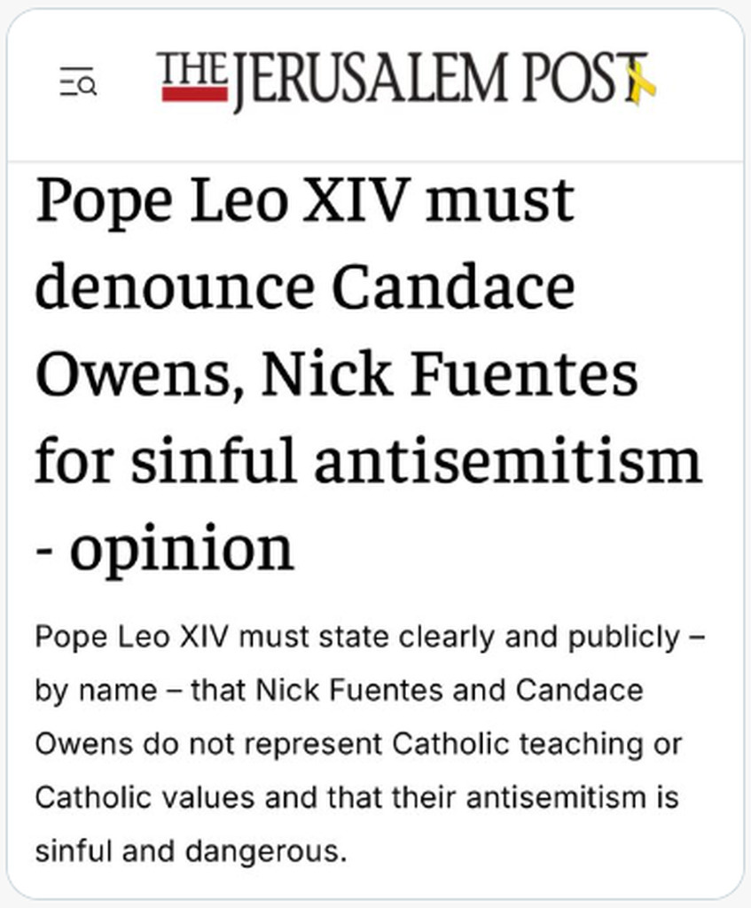 Pope Leo XIV must denounce Candace Owens, Nick Fuentes for sinful antisemitism - opinion Pope Leo XIV must state clearly and publicly – by name – that Nick Fuentes and Candace Owens do not represent Catholic teaching or Catholic values and that their antisemitism is sinful and dangerous. https://www.jpost.com/opinion/article-874619