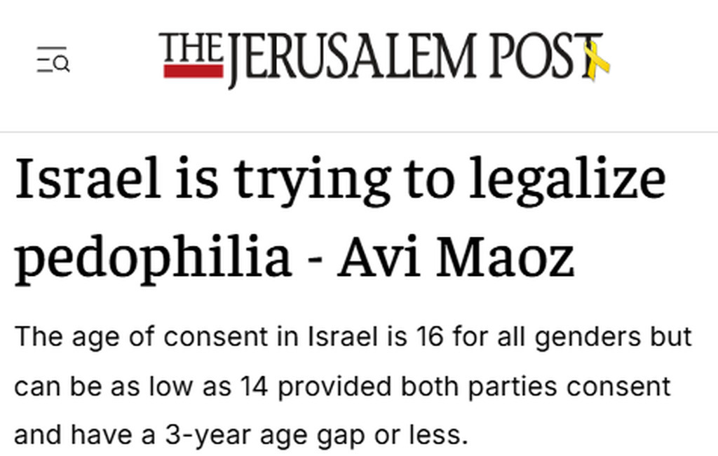 MAY 2, 2023 Israel is trying to legalize pedophilia - Avi Maoz The age of consent in Israel is 16 for all genders but can be as low as 14 provided both parties consent and have a 3-year age gap or less. Israeli far-right lawmaker Avi Maoz accused the Justice Ministry of...See more