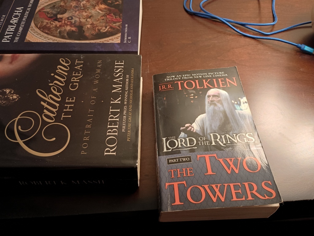 1. My bedside. 2. My coffee table with new order of books.
