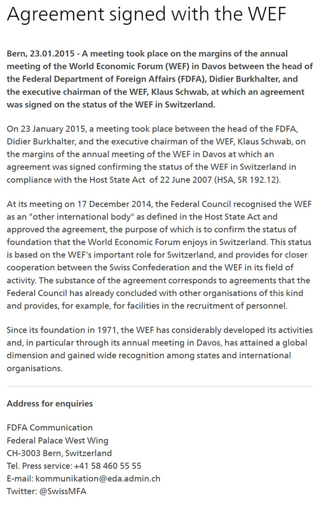 In 2015, the Swiss Federal Government signed an agreement with the WEF that granted it the status of an international institution with full diplomatic immunity: https://www.admin.ch/gov/en/start/dokumentation/medienmitteilungen.msg-id-55987.html