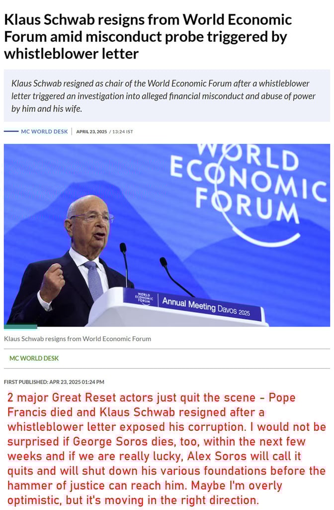 According to the linked article, the WEF has been systematically undermined by white hat infiltrators: https://rayviolet11.blogspot.com/2025/06/wef-global-elite-empire-collapses.html Klaus Schwab has indeed been exposed. The question is: how far does this go? If the article is right, massive amounts of documents should expose WEF corruption. That would be fantastic, but for now, I'll wait and see... https://www.minds.com/newsfeed/1784359964760870912