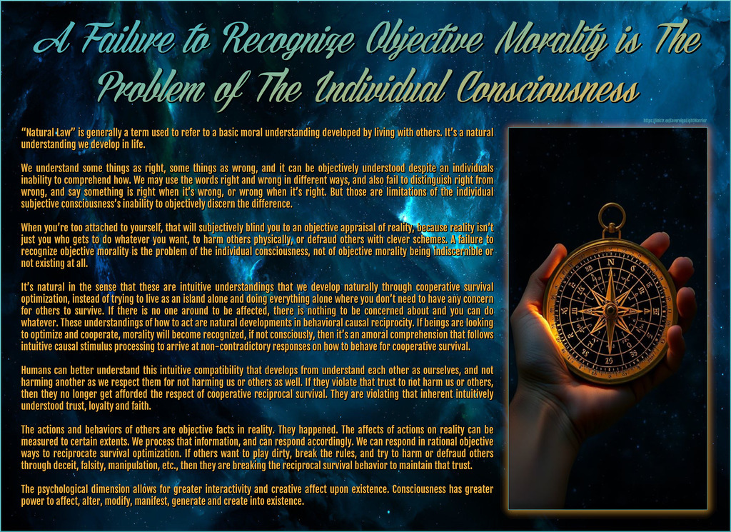 ➝ A Failure to Recognize Objective Morality is The Problem of The Individual Consciousness. “Natural Law” is generally a term used to refer to a basic moral understanding developed by living with others. It’s a natural understanding we develop in life. We understand some things...See more